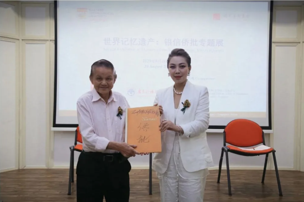 展览进程中,暖心时刻频现:新加坡石叻坡民俗文化馆馆长陈来华先生慷慨捐赠一批珍贵的新加坡侨批实物予广外。王凯宏教授代表学校接受这份厚礼,并对陈馆长的慷慨义举致以诚挚谢意,强调此举将极大充实广外的侨批收藏体系,为华侨文化学术探究注入宝贵实证支撑。此外,新加坡孙中山南洋纪念馆馆长一行专程观展,王凯宏教授为其详解展览精髓,并代表广外馈赠纪念品。孙中山南洋纪念馆馆长高度评价本次展览,认为其内容详赡、呈现生动,深刻激发了海外华侨的民族赤诚。